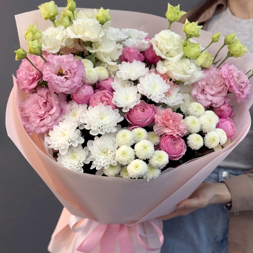 Букет "Задыхаюсь от нежности" из хризантемы, кустовых пионовидных роз, диантусов и эустом