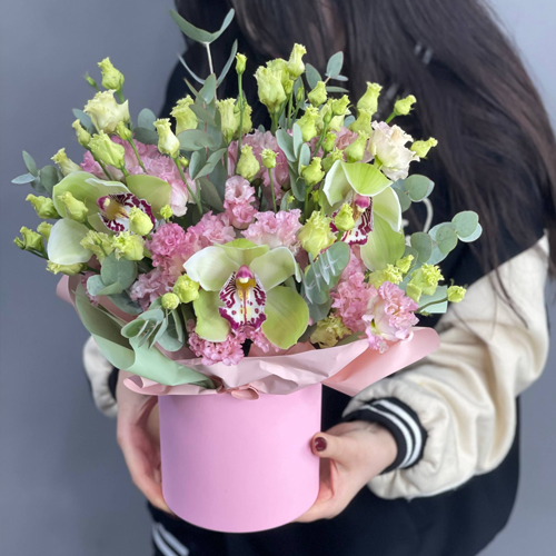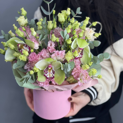 Композиция в шляпной коробке "Melody" из лаймовых орхидей и эустом