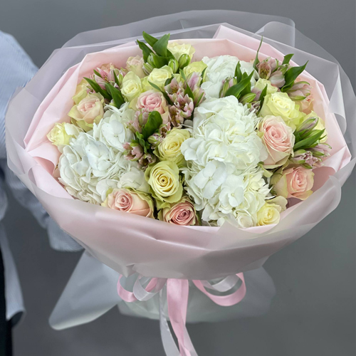 Букет "Поля" из роз, альстромерий и гортензии