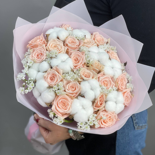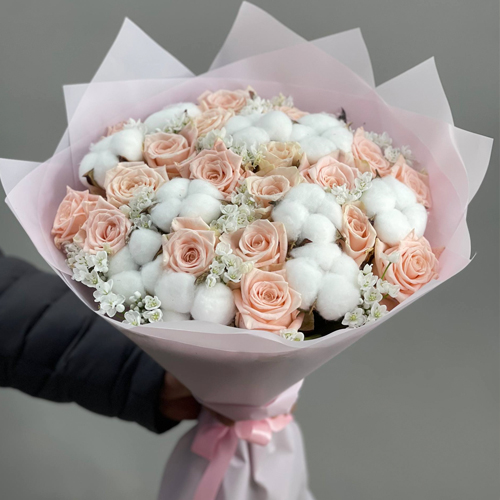Пудровый букет из роз, хлопка и аллиума
