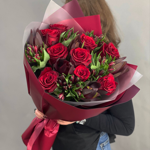 Букет "Татьяна" из красных роз Эквадор, альстромерии и сафари