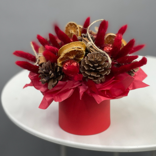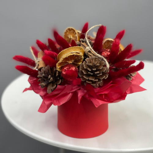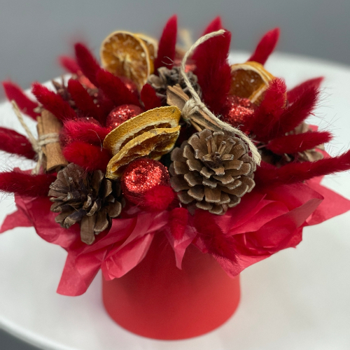 Композиция в шляпной коробке "Глинтвейн" из шишек, корицы и лагуруса